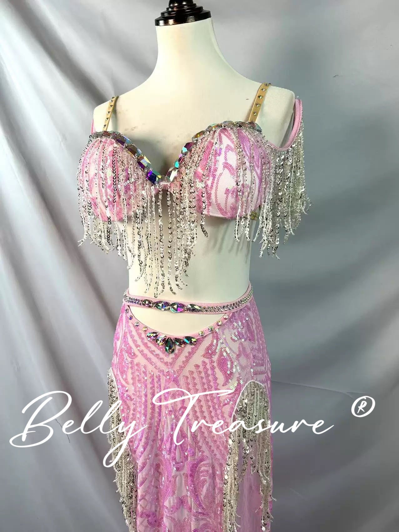 衣装には立体のアクセサリーが輝いてますオーダーメイドベリーダンス衣装です。
