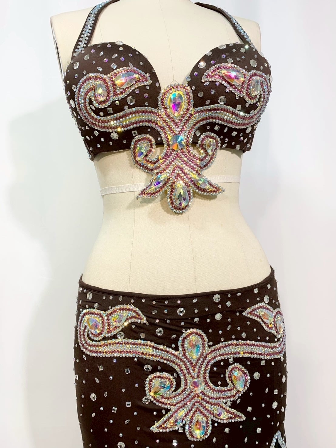 衣装には立体のアクセサリーが輝いてますオーダーメイドベリーダンス衣装です。