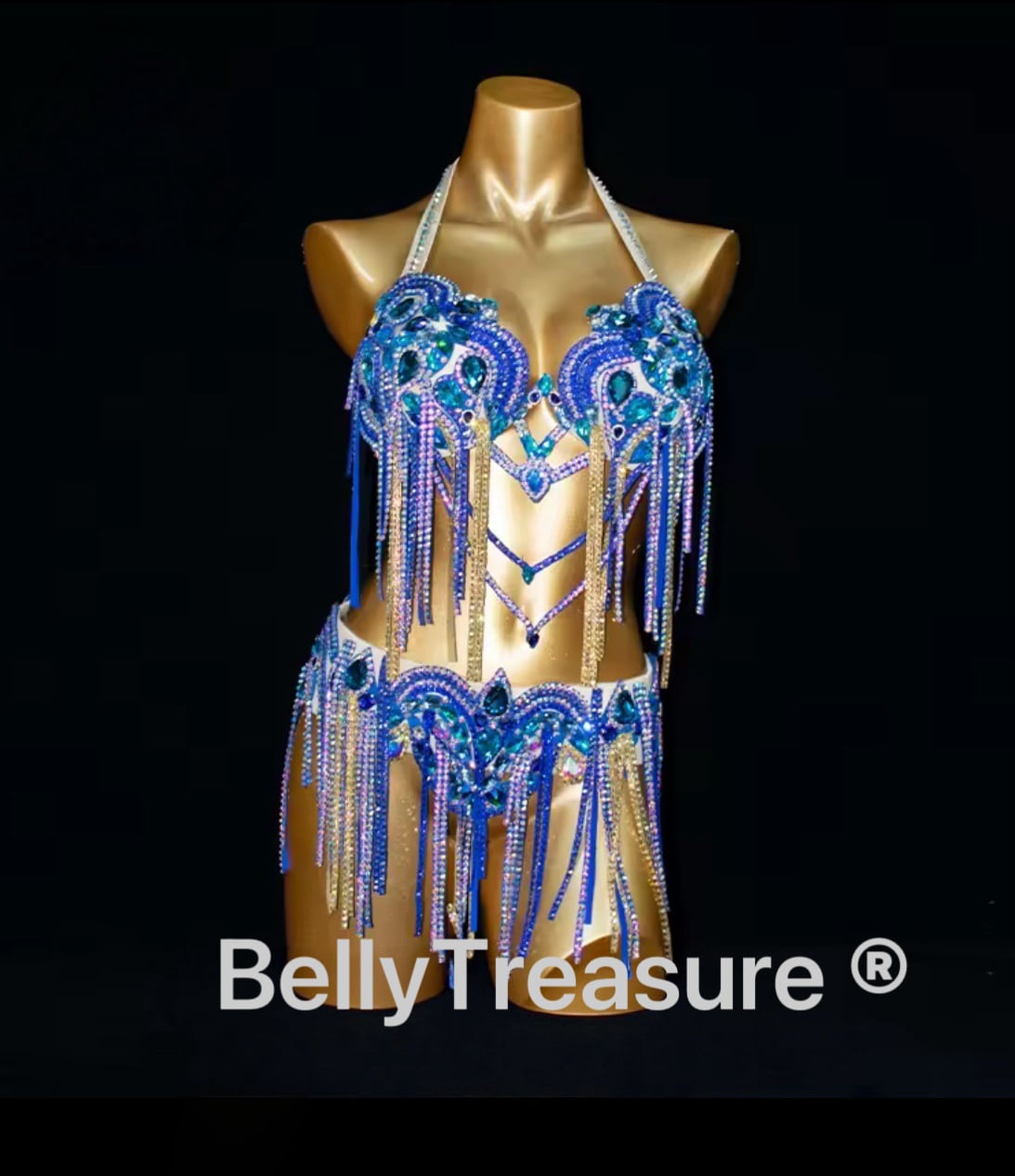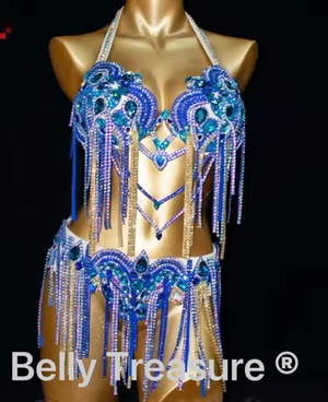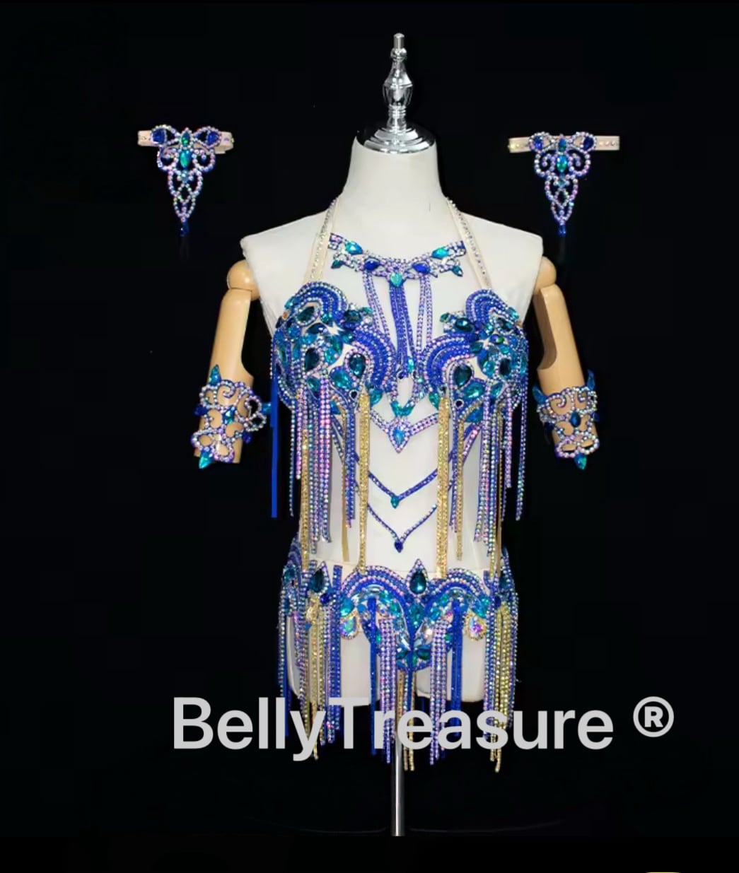 衣装には立体のアクセサリーが輝いてますオーダーメイドベリーダンス衣装です。