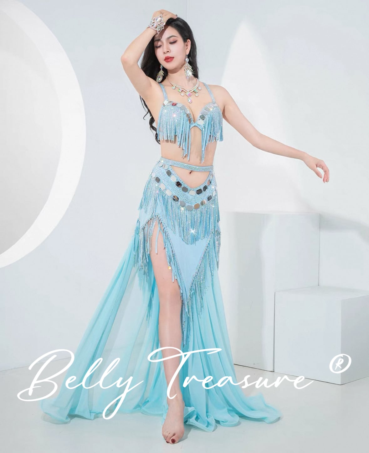 衣装には立体のアクセサリーが輝いてますオーダーメイドベリーダンス衣装です。