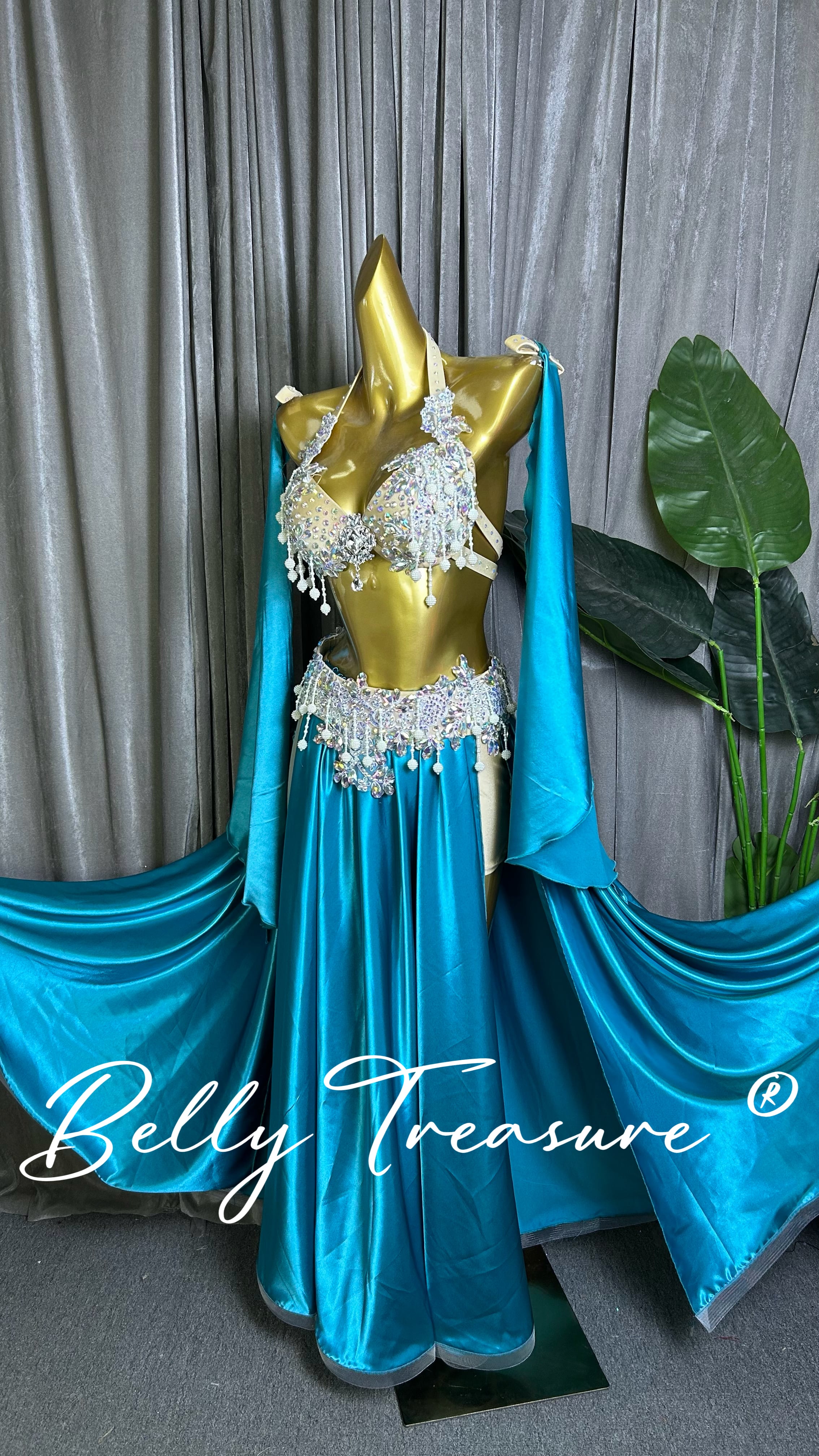 衣装には立体のアクセサリーが輝いてますオーダーメイドベリーダンス衣装です。