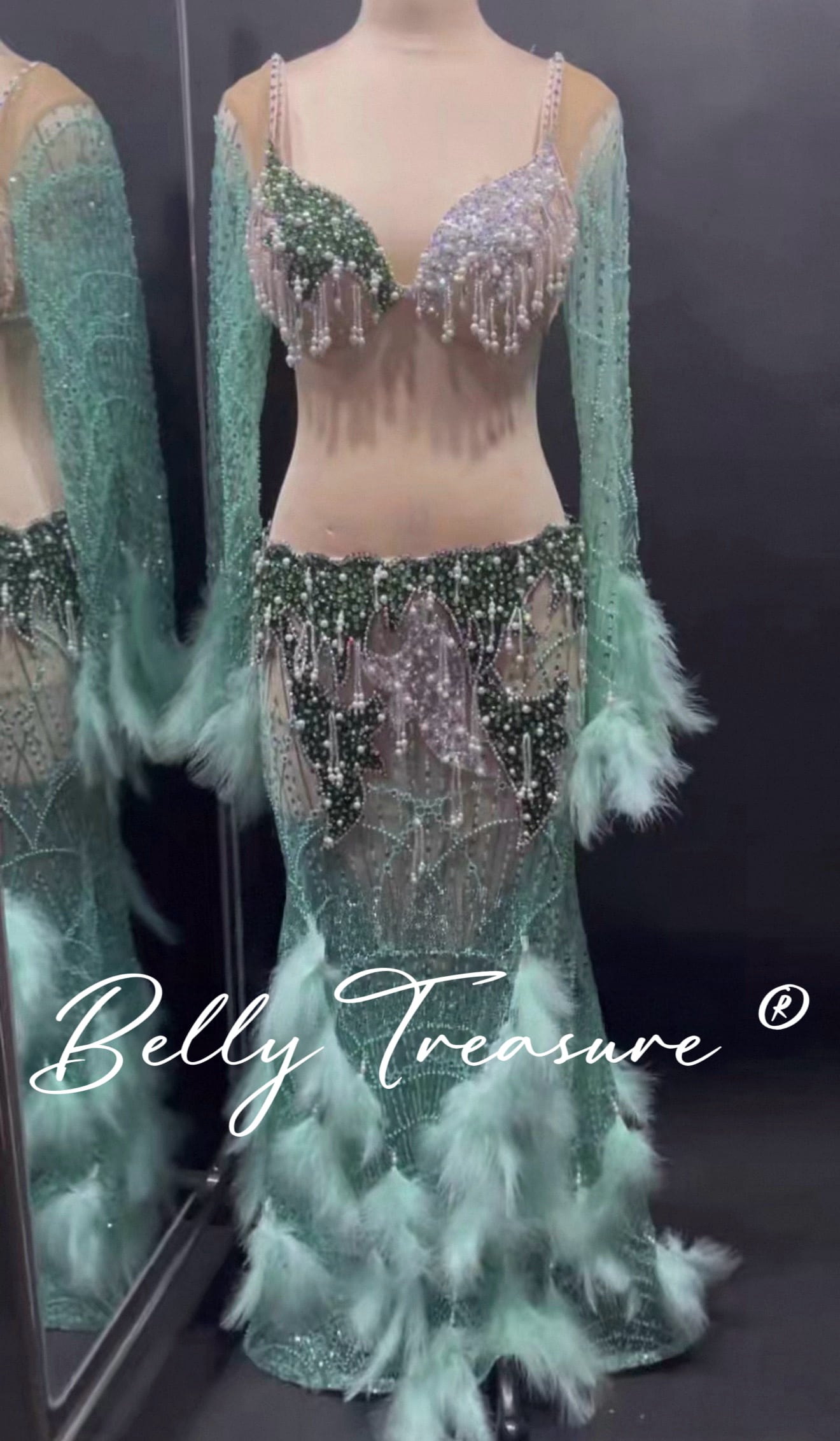 衣装には立体のアクセサリーが輝いてますオーダーメイドベリーダンス衣装です。
