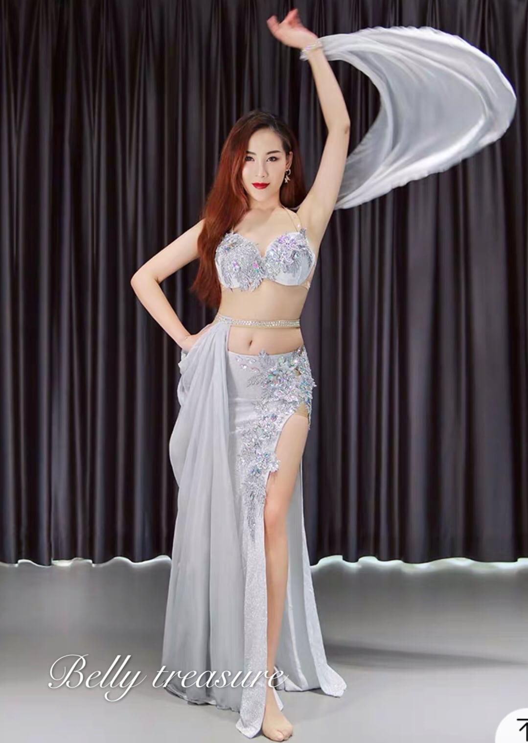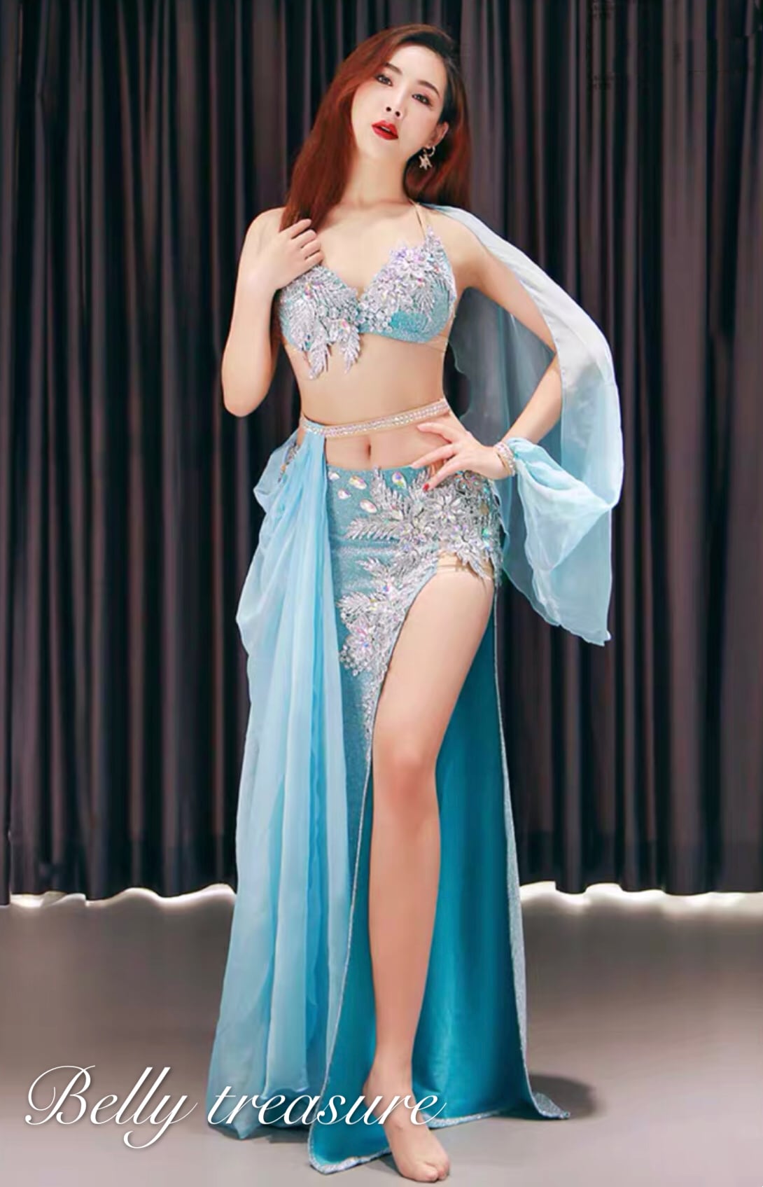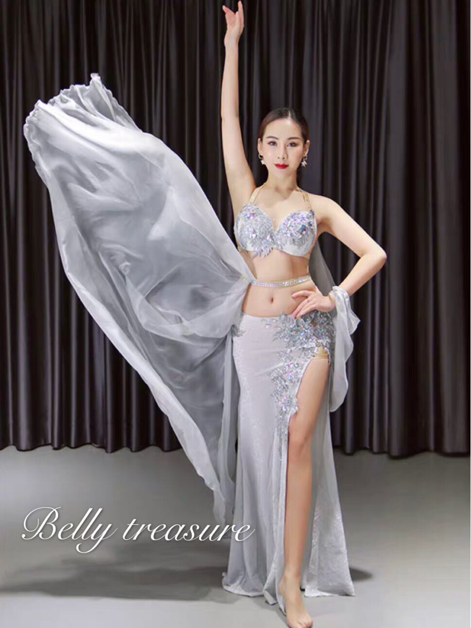 衣装には立体のアクセサリーが輝いてますオーダーメイドベリーダンス衣装です。