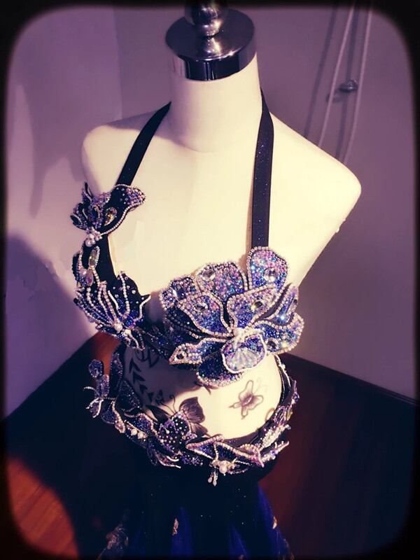 衣装には立体のアクセサリーが輝いてますオーダーメイドベリーダンス衣装です。