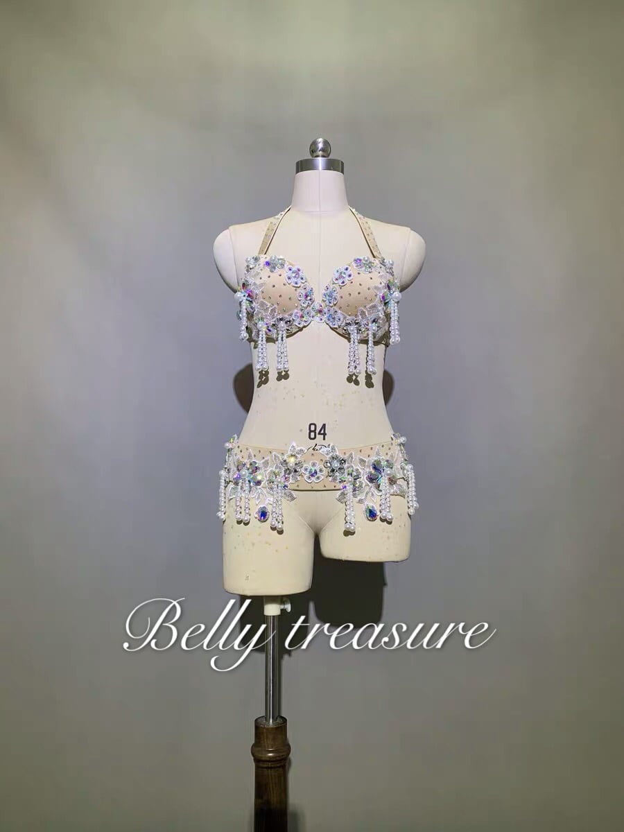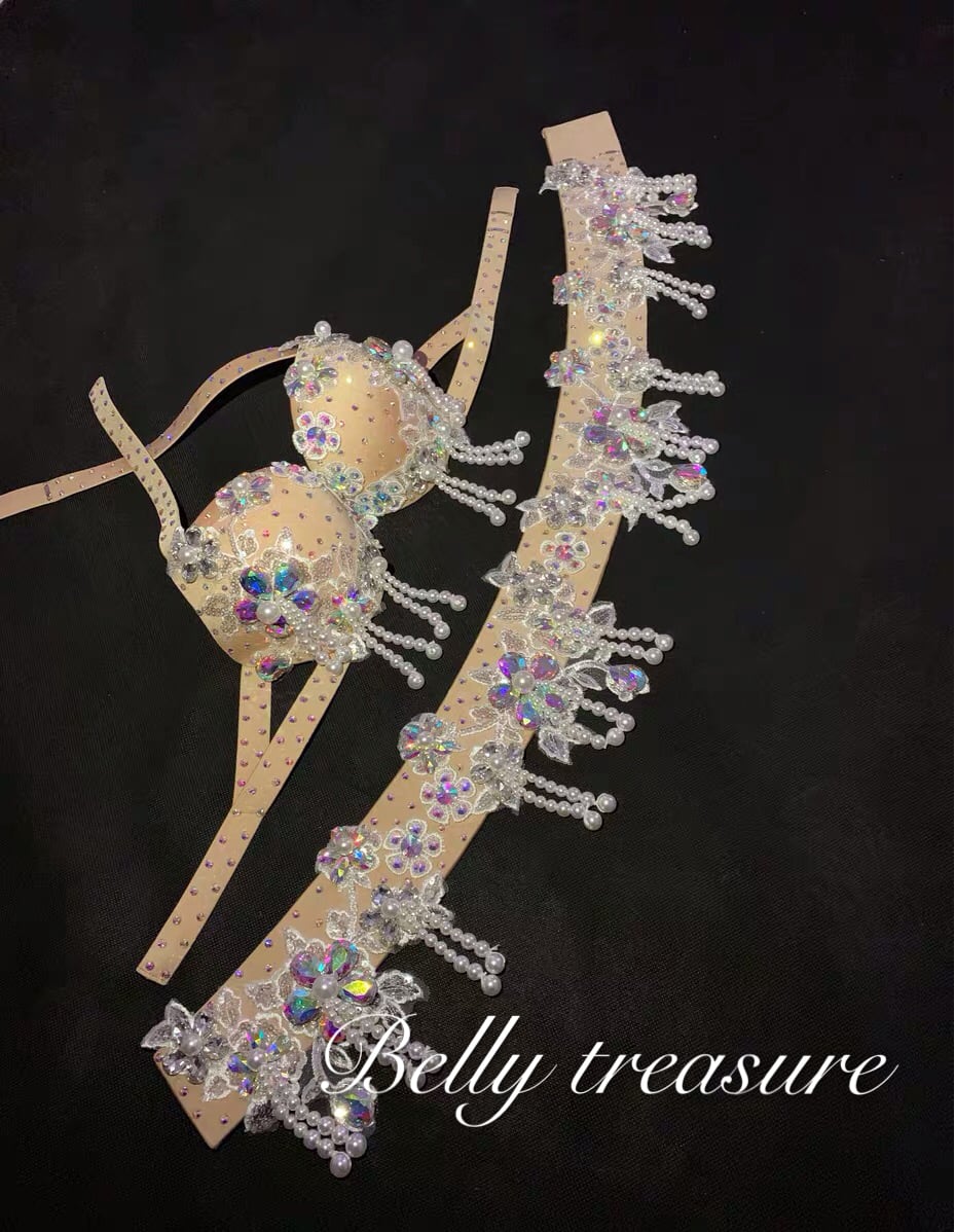 衣装には立体のアクセサリーが輝いてますオーダーメイドベリーダンス衣装です。