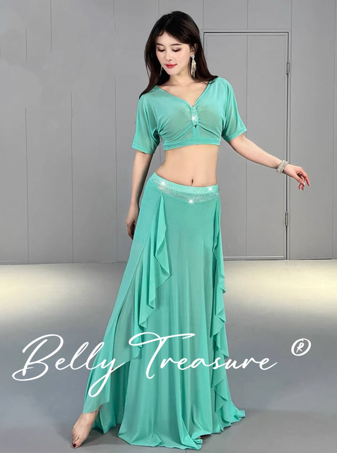 【翌日発送可能商品】ベリーダンス エメラルドグリーン Vネックドレープセットアップ レッスンウェア WN-1285-202411