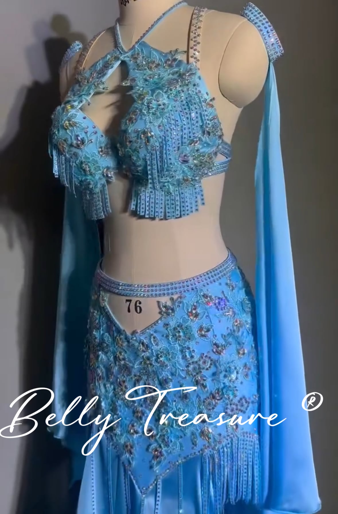 衣装には立体のアクセサリーが輝いてますオーダーメイドベリーダンス衣装です。